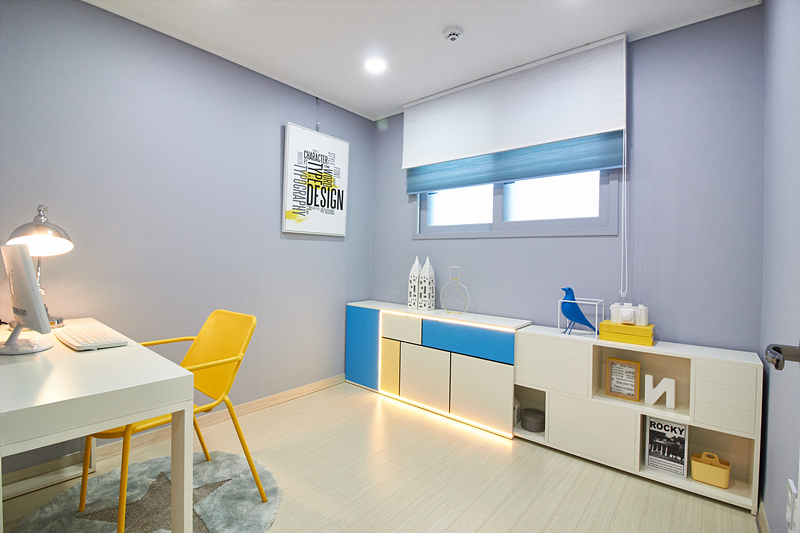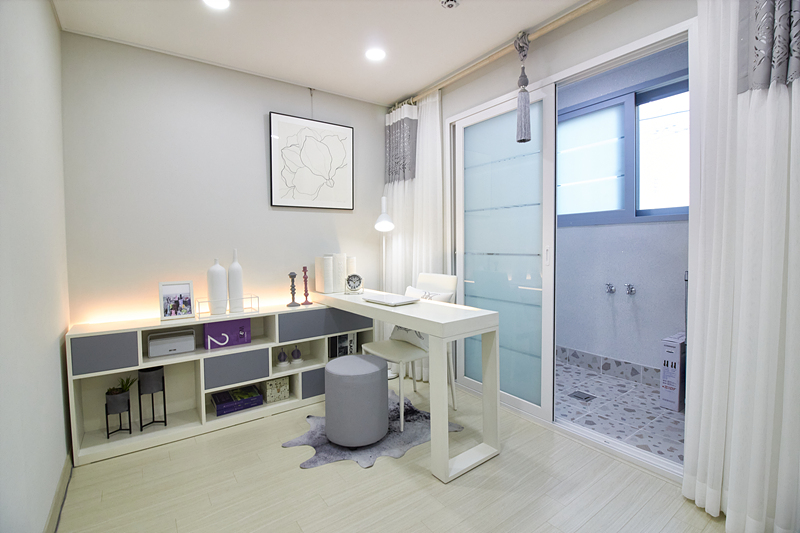안방은 약 11자 사이즈로 부부가 사용하기에 좋습니다. 별도의 붙박이장과 시스템 에어컨도 시공되어 있어 편리합니다. 아이방으로 사용하기에도 좋은 크기입니다. 욕실은 두 곳에 설치되어 바쁜 아침시간에도 불편함이 없습니다. 베란다에는 세탁기와 건조기가 배치될 수 있습니다.