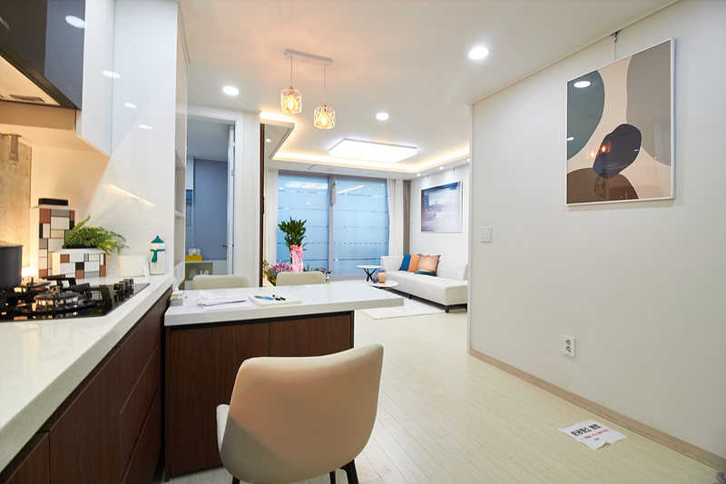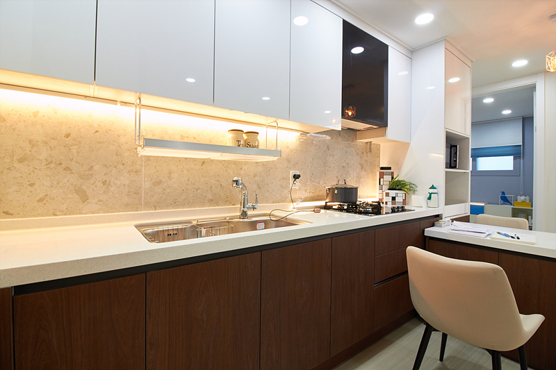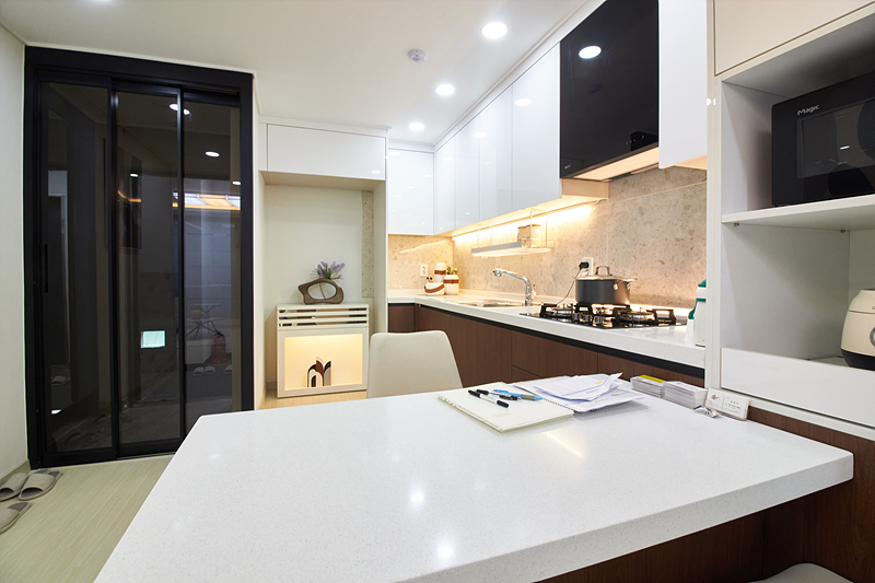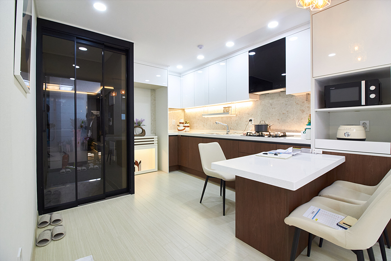 주방은 일자형 구조로 설계되어 공간이 로스되는 부분이 없습니다. 식탁으로도 사용 가능한 아일랜드식탁과 넉넉한 수납장이 있습니다. 인테리어는 원목과 화이트 색상으로 투톤 처리되어 고급스러움을 더해줍니다.