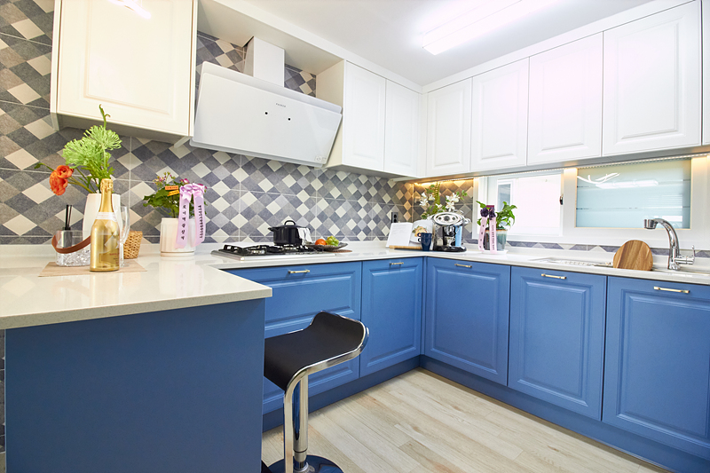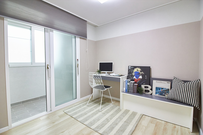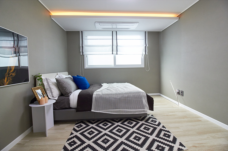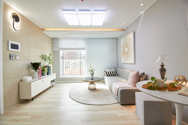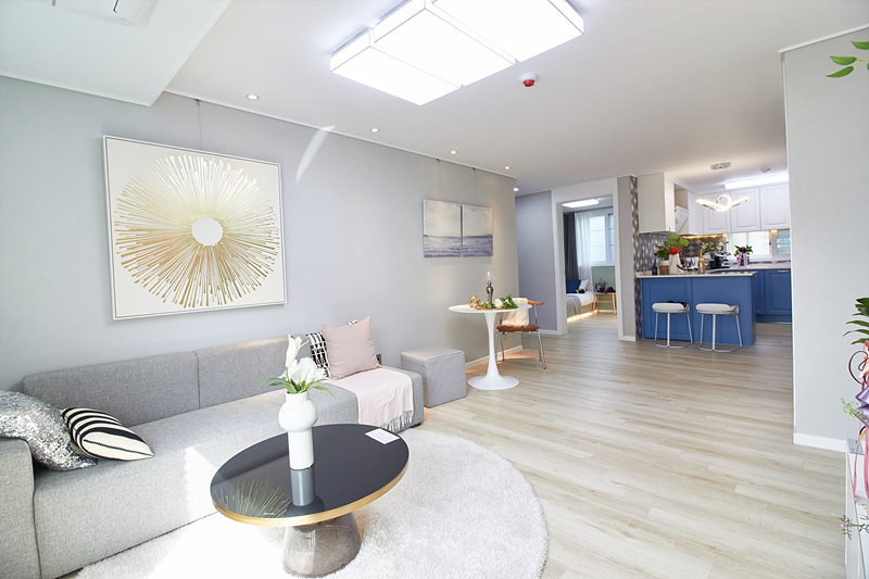 거실은 전면에 큰 창이 있어 환기가 편리하며, 테라스가 밖으로 이어져 있어 적절한 구조입니다. 공간 활용을 높이기 위해 시스템 에어컨과 LED 조명이 설치되어 있습니다. 주방은 화이트와 블루 컬러로 꾸며져 깔끔하고 상쾌한 분위기를 자아냅니다. 더불어 'ㄷ'자 구조의 조리대에는 3구 가스레인지와 대형 싱크볼이 있어 사용하기에 편리합니다.