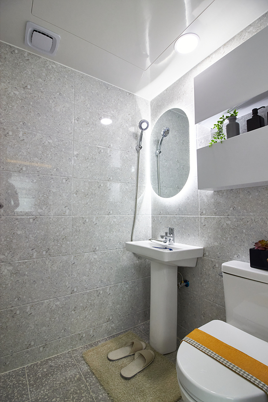 빌라 내에는 공용 욕실이 있으며 넓은 공간을 확보하여 샤워할 수 있는 공간을 제공합니다. 더불어 변기, 하프 세면대, 레인 샤워기 등이 일렬로 설치되어 사용하기 편리합니다.
