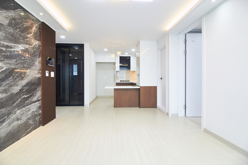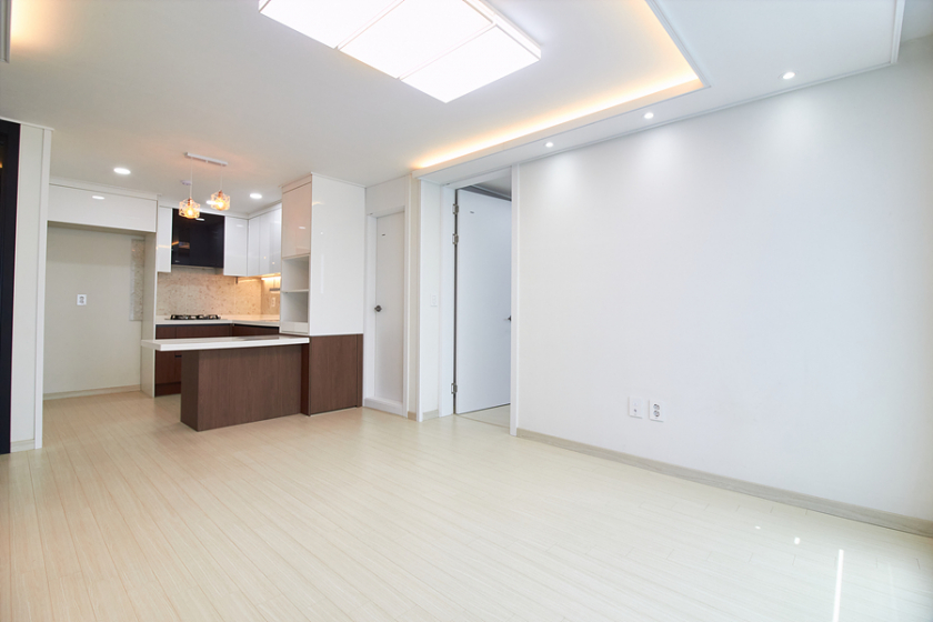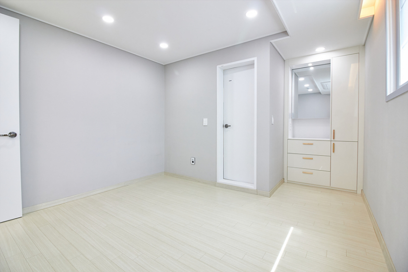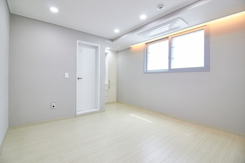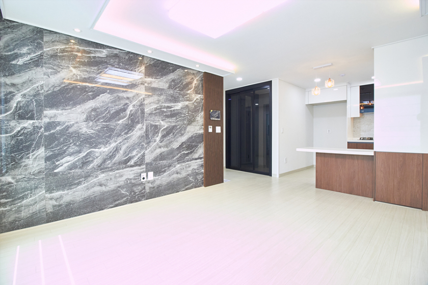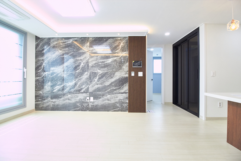 넓은 거실은 채광이 좋아서 낮에는 조명이 필요하지 않을정도로 밝습니다. 거실은 공간이 넓고 대형 쇼파나 테이블 등을 배치할 수 있습니다. 당수동신축빌라는 시스템 에어컨이 설치되어 있어 바닥 공간 활용도도 높습니다.