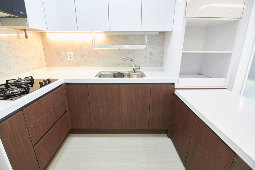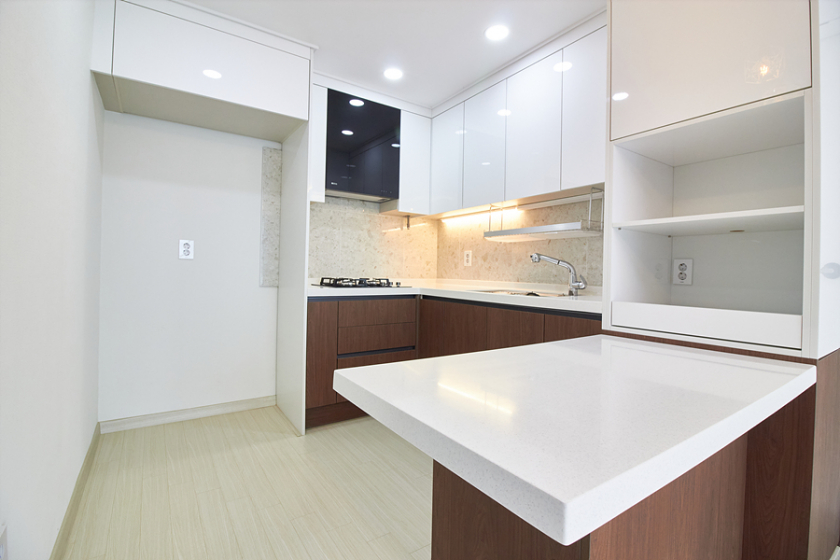 주방은 일자형 구조로 설계되어 공간이 로스되는 부분이 없습니다. 식탁으로도 사용 가능한 아일랜드식탁과 넉넉한 수납장이 있습니다. 인테리어는 원목과 화이트 색상으로 투톤 처리되어 고급스러움을 더해줍니다.
